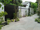 ご新築の外構工事です。自然の要素を取り入れてあまり堅くならないようにしたいとのご要望でした。平屋建て住宅のバランス感を崩さないように門周りはシンプルに構成し、階段とアプローチをゆっくりと取り伸び伸びとした空間となるよう設計しました。アイポイントのスルーブロックと自然石積がお家との一体感を演出。白壁に樹木のグリーンが綺麗に映えてとても素敵です。