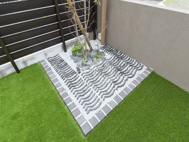 駐車場とお家に高低差があり、お庭から車庫まで傾斜があったため、玄関までの行き来がしやすいように設計しました。幅4.5m、高さ2.0mの大きな門塀とフレームが印象的な、広い2世帯住宅にふさわしい重厚感ある外構に。階段は踏面を通常より広い45cmに設定し、小さなお子さまからご年配の方まで安心して上り下りできるよう配慮しています。途中には花壇を設け、緑を感じながらお家へと導くデザインに。デッキにはLIXILの「樹ら楽ステージ木彫」を採用し、リビングとお庭をつなぐ心地よい空間に仕上げました。人工芝の広がるお庭では、お子さまがのびのび遊べる明るい空間に。さらに、以前のお家の瓦を再利用した和風ガーデンを設け、思い出を受け継ぐあたたかなお庭が完成しました。