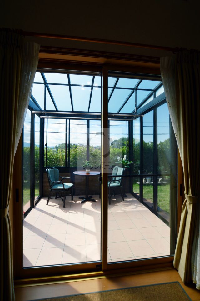 第二のリビング空間とお洗濯物干しスペースの確保の為のガーデンルーム計画でした。 当初は既存のテラス屋根をガーデンルームへ…とのことでしたが排水マスとの絡みもあり設置場所を変更。結果的にリビング窓の正面になりましたが使い勝手は向上。コンセントの増設なども行い快適なガーデンルーム生活の始まりです。