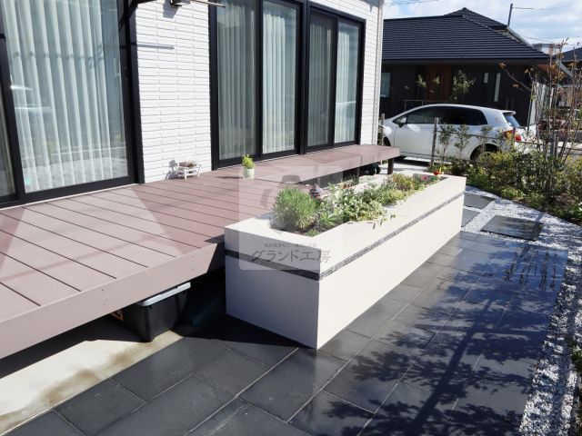 ご新築後、手つかずのお庭を活用したいとご依頼を頂きました。 デッキからスムーズに降りられるよう階段を設け、石貼りのテラスをご提案。ランダム貼りでナチュラルかつ天然石の高級感が出ます。デッキ前には高さのある花壇をつくり、デッキからもテラスからもお手入れしやすく緑を楽しめます。花壇のワンポイントにも大理石モザイクタイルを使い、天然物にこだわったお庭です。