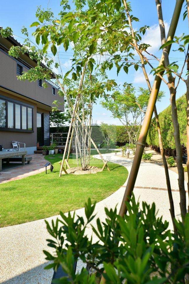 お庭の中を歩くアプローチが欲しい、植木や芝生を植えたいとご相談頂きました。もともとあった石貼りと合わせ、曲線のアプローチをご提案。木に囲まれた小道が心地良い空間です。お庭の一角には、ウッドデッキや自然石テラスもあり、寛げるスペースもあります。天然木デッキ、自然石テラス、天然芝・・と本物にこだわり、自然の優しさを感じられるお庭となりました。