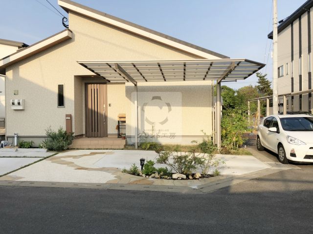 新築を建ててしばらく経ったW様、そろそろカーポートだったりが欲しいなとのことでご来店されました。 建物の雰囲気がナチュラルで優しい色味だったので、そのイメージを壊さず、明るいアプローチを意識しました!植物を植えられるスペースを多くとったのでこれからご家族で育てていただけるようです。