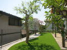 虫が多く、荒れ放題でお庭に出られないのでどうにかしたいというご相談でした。お手入れもあまりできないということで、既存の樹木をある程度残して枝抜き剪定、緑が感じられ、なおかつ、手入れがいらないように人工芝をご提案しました。結果、うっそうとしていたお庭が明るいお庭になりました。細かい納まりも職人さんの腕で綺麗に収まっています。これは残したかったユズが一層際立つようになりました。
