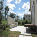 建売住宅購入後のお庭づくりのご相談を受け、リビングの窓からの目隠しとしてデザインウォールを設置し、プライベート空間を確保しました。リビングと洋室をタイルテラスで繋ぎ、花壇やベンチを配置して使いやすさと景観を両立。外構には目隠しフェンスを設置し、一部コンクリートを壊してバイクガレージを施工。植栽は最小限に抑え、人工芝を敷いて手入れを簡単にし、モノトーンの高級感あるアウトドアリビングを完成させました。