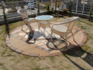 テーブルを置くためのサークルを設置。素材の組み合わせで眺めても楽しいデザインに。サークルのまわりは芝生を張りくつろぎのスペースとなりました。