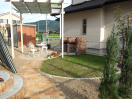 広い敷地の真ん中には料理が得意な旦那様がお客様を呼んでバーベキューパーティーが出来る様、ベンチを2箇所設けて大きなサークルテラスを設置。また奥様こだわりのコッツストーンは積んで高さを出すことでお庭のアクセントになりました。