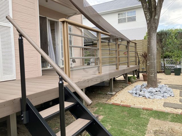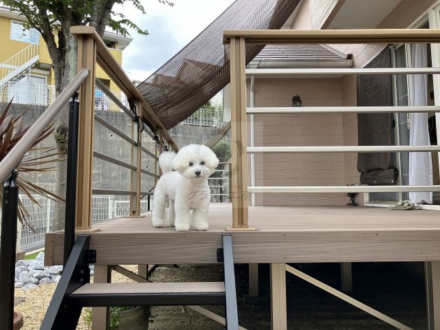 既存の天然木デッキが傷んできたことから、ご相談をいただきました。人工木デッキへリフォームし、わんちゃん用の柵も拡張。デッキとお庭を自由に行き来できるようになり、走り回って大喜びとのことです。新しいデッキは夏場の熱を抑える素材を採用しており、足元にもやさしい仕上がりに。ステップや手すりも設け、安心して使えるよう工夫しました。お家の形状に合わせたデザインで、動線とくつろぎの両方を叶えた空間に生まれ変わっています。