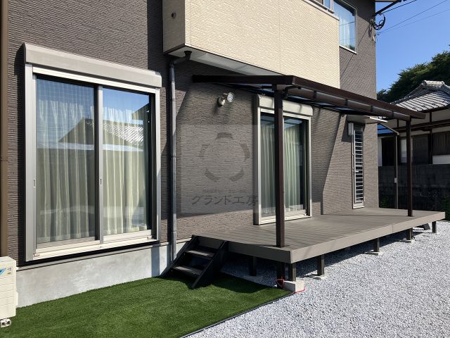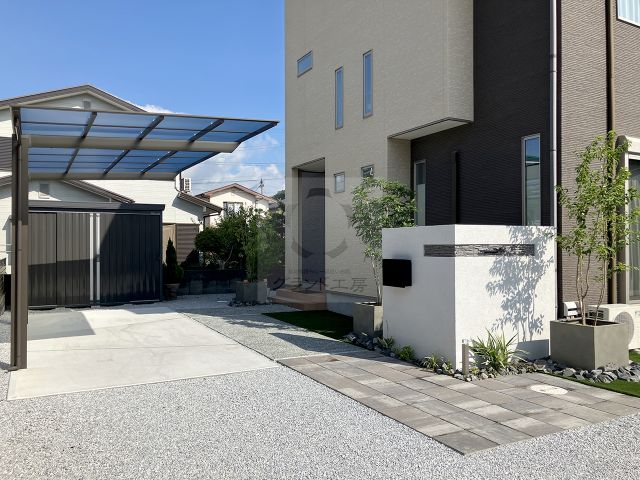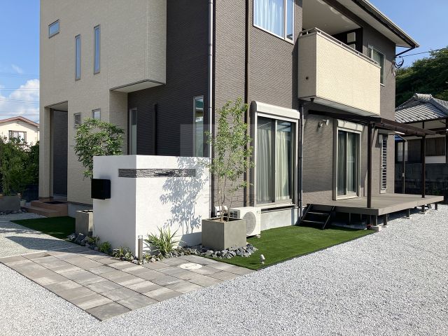 ご新築から数年が経ち、暮らしの中で見えてきた「こうしたい」を一つひとつ形にして、建物と調和した格好良い外構が完成しました。玄関まわりには車を1台駐車できるようスペースを確保し、室外機やポンプが目立たない位置にL字型の門塀を配置。タイルやアプローチには建物と相性の良いブラウン系の素材を選び、植栽の緑が映える落ち着いた雰囲気に仕上げています。お庭には勝手口と掃き出し窓から出入りできる樹脂デッキを設置し、同色のテラス屋根で雨の日も快適に。ゴミ出しやワンちゃんのお散歩もスムーズになりました。裏庭にも屋根と竿掛けを設け、洗濯動線をしっかり確保。さらに雑草対策として防草シートと砂利を敷き、お手入れのしやすい空間に。昼も夜も快適に過ごせる、暮らしに寄り添う外構が完成しました。
