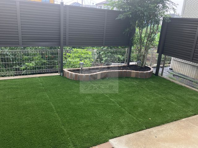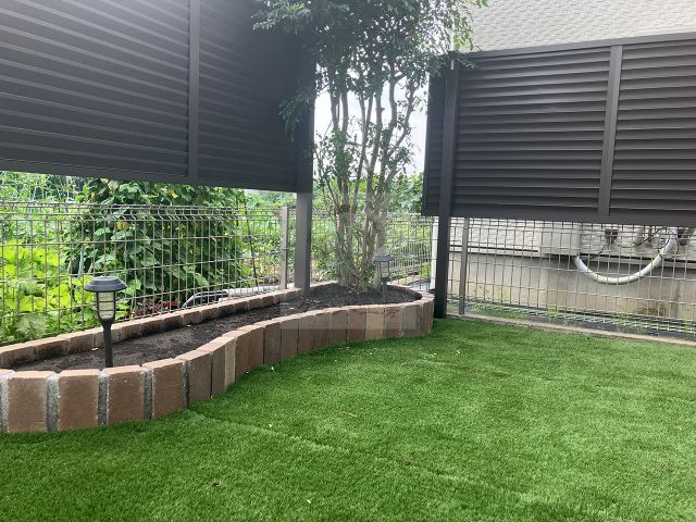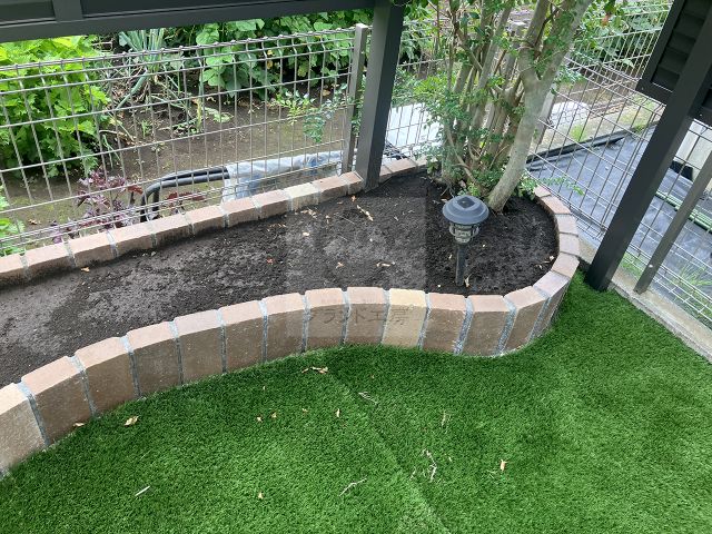 人工芝が広がる、お子さんがのびのび遊べるお庭が完成しました。以前は土の面積が多く、花壇や菜園として使える反面、お手入れが大変で遊びづらい環境でした。今回、既存のレンガや植栽を一部撤去し、人工芝を敷いて雑草対策もばっちりに。駐車場との段差もなくなり、安全に走り回れるようになりました。レンガ花壇はやわらかな曲線デザインで、おうちの雰囲気にもぴったりです。フェンスも追加設置し、安心して過ごせるプライベートなお庭へと生まれ変わりました。