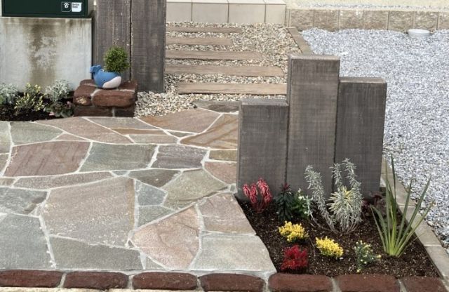 ナチュラルな雰囲気を大切にしながら、お手入れしやすい外構が完成しました。既存のポストや枕木、オリーブの木を活かしながら、アプローチとお庭をリニューアル。玄関までの動線には外観に馴染むグリーン系の乱形石を使用し、自然な華やかさを演出しました。ポスト側の枕木に合わせて低めの枕木も追加し、植栽と美しく調和するやさしい印象に。お庭は天然芝から人工芝へ変更し、メンテナンスの負担を軽減。人工芝と砂利の境界にはレンガの縁取りを施し、全体に統一感を持たせました。オリーブの木の周囲もレンガで囲んでアクセントをプラス。毎日が少し心地よくなる、ナチュラルで優しい外構空間が完成しました。