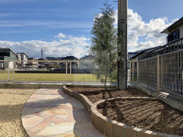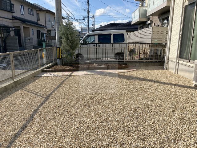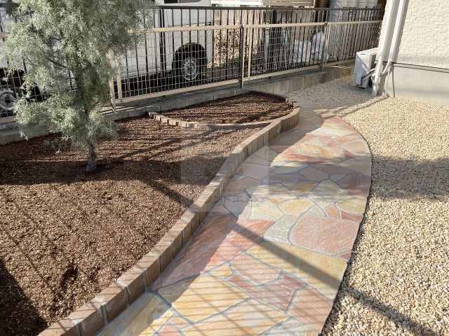 お庭いっぱいに広がる雑草に長年お悩みだったお客様。草取りで手を痛められ、ご自身での管理が難しくなったことをきっかけにご相談くださいました。負担を減らすため、全面に防草シート+砂利敷きでしっかり対策。砂利はお好みに合わせたナチュラルなマーブル砂利を選定しました。「これからは気軽に植栽も楽しみたい」との想いから、ソイルレンガで花壇を新設。やさしい色味が空間をあたたかく包みます。花壇まわりにはクオーツストーン(イエロー×ローズ)をミックスした乱形石アプローチを施工し、明るさと落ち着きのバランスにもこだわりました。玄関ポーチ横の自転車置き場も砂利敷きとし、雑草対策と設備点検のしやすさを両立。これからは草取りに追われず、植栽を楽しむ時間が増えていきますように。